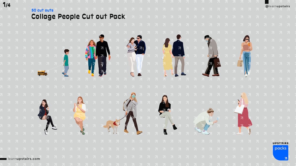 This pack is a collection of 50 unique collage people, custom-drawn by the Upstairs team to ensure you get assets you won’t find anywhere else. Each figure is meticulously crafted in Adobe Illustrator, providing you with editable vector shapes for the highest level of quality.
