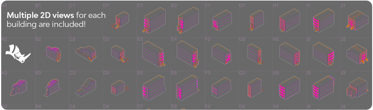 All buildings in this pack were modeled natively in Rhino, starting from clean and well-structured 3D geometry. From these models, we generated consistent 2D outputs to support different types of drawings and representations.