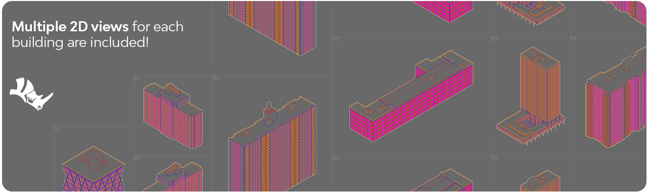 All buildings in this pack were modeled natively in Rhino, starting from clean and well-structured 3D geometry. From these models, we generated consistent 2D outputs to support different types of drawings and representations.