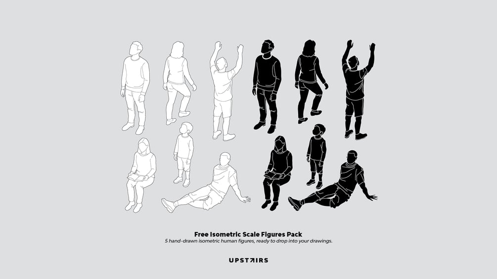 A free sample pack with five hand-drawn isometric human figures, ready to drop into your drawings. Designed with clean strokes and white fills, they’re perfect for conceptual plans, diagrams, and axonometric views.