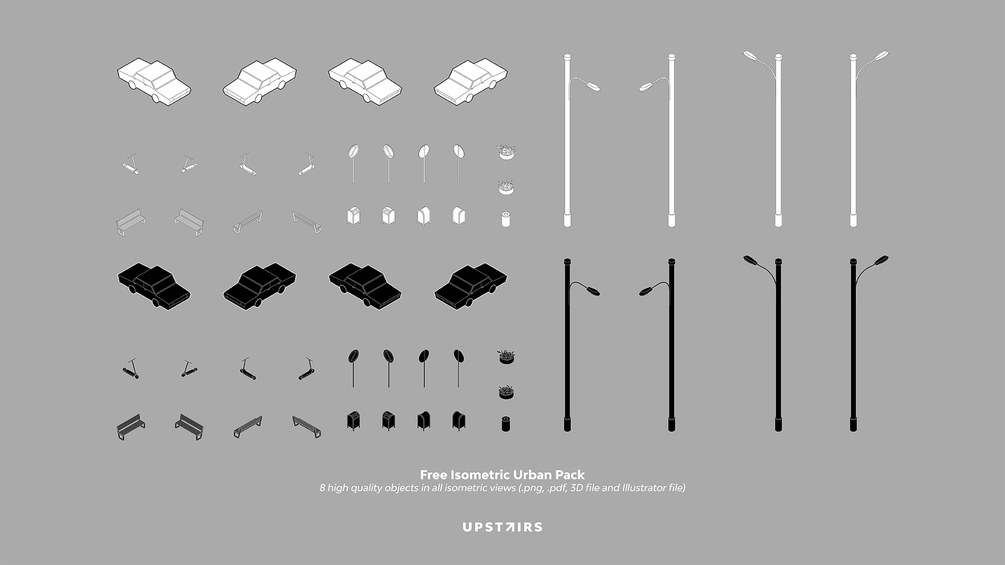 This free pack includes 8 isometric objects to help you get started. You’ll find them in PDF and PNG formats (available in both Black and White styles), as well as the Illustrator and 3D/SketchUp files for easy customization.
