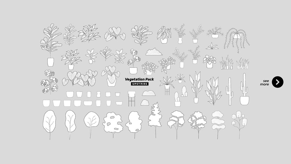 Introducing our first pack fully dedicated to vegetation, featuring 60+ hand-drawn trees, bushes, plants, and pots! Designed by the Upstairs Team, this pack offers a variety of styles to suit any project, whether you’re creating sections, renders, or collages.